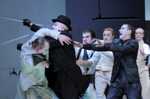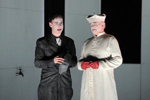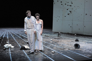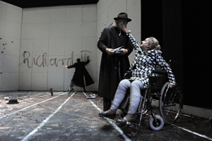 Warum Richard jetzt der große wankelmütige, sorglose erste Spieler seines Landes sein soll, warum sich Unmut häuft bei seinen Untertanen, warum die Loyalität abbröckelt, was ihn denn zum Rachefeldzug nach Irland treibt, warum man ihn denn überhaupt als König akzeptiert in einer Ära der mächtigen Regionalfürsten, all das lässt die Fassung des Berliner Ensembles aus dem Jahr 2000 (angeblich „generalüberholt“ für Wien) völlig offen. Motivationen werden platt übergangen, im Zweifelsfall regiert die verbale Behauptung. Viel wird geredet, selten die Sprache der neuen, gelungenen Übersetzung genutzt. Und so springt dieser Richard von Szene zu Szene, wie in einer Collage, ohne stringente, treibende Kraft. Auch dieser Sichtweise wäre noch dramaturgisch etwas abzugewinnen, wenn nicht an anderen Ecken wieder Geschichte und Handlung angedeutet würden, das Narrative erschöpft sich dabei aber weitgehend im flapsigen Plauderton.