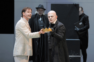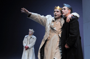 Lediglich Veit Schubert schafft es an diesem Abend absolut glaubhaft und berührend, schlüssig und detailreich den ebenfalls zaudernden Kontrahenten Bolingbroke so auf die Bühne zu bringen, dass gepackt, gespannt und mitgerissen zugesehen wird. Das war wirklich gutes Schauspiel. Maria Happel verschleudert ihre Fähigkeiten (die kurz bei der Herzogin von Gloster aufblitzen) in der x-ten Wiederholung der Ulk-Nummer, für die man sie im Haus am Ring unseligerweise gepachtet zu haben scheint. Grundsätzlich gute Darsteller, wie Johannes Krisch, Martin Schwab oder Dorothee Hartinger werden an diesem Abend ein Opfer der sich nicht entscheidenden, wirr hüpfenden und stets im Unklaren zwischen Karikatur (zwischendurch berlinert da ein englischer Lord munter drauf los) und Tragödie (Verlust? Intrige? Mord? Angst?) verweilenden, und, ja, eben zaudernden Inszenierung.