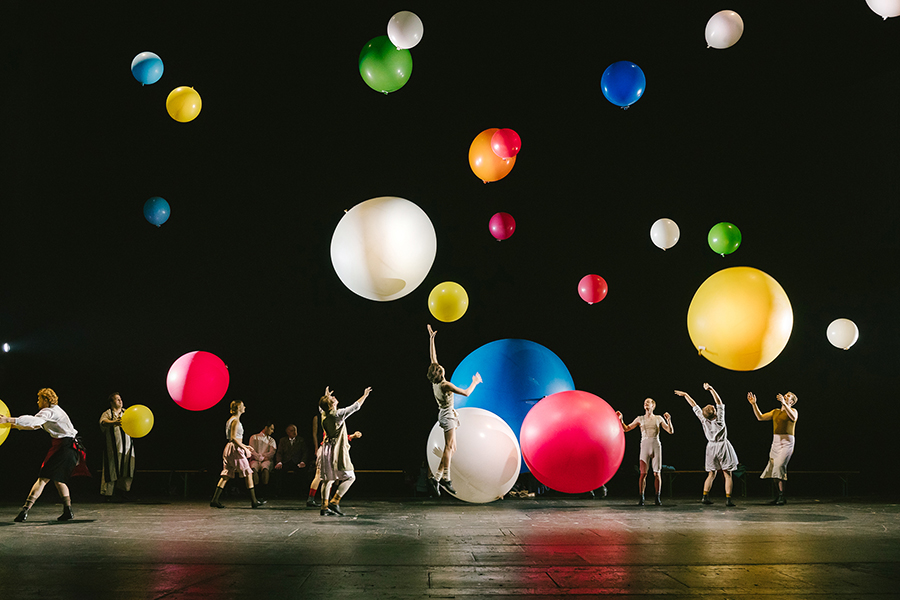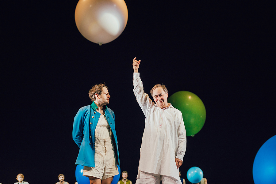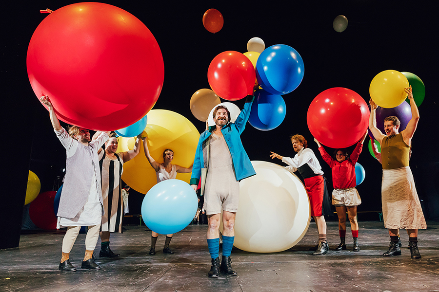 Das Bühnenbild im Burgtheater, das aus gelben, pinken, roten und blauen, kleinen, mittleren und überdimensional großen Luftballons besteht, sorgt dafür, dass ein Nickerchen während der vierstündigen Aufführung für die Zuschauer unmöglich wird.