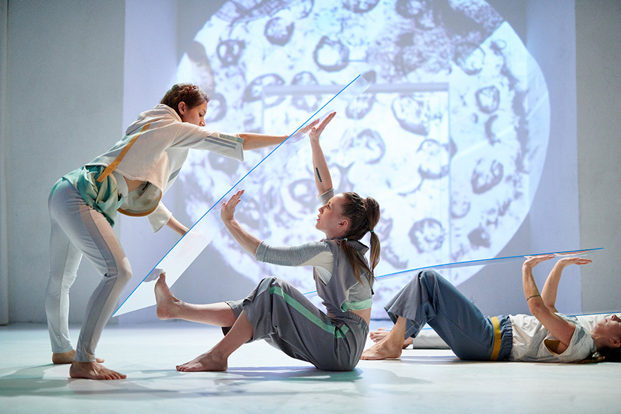 Der tägliche Lebensassistent in der Zukunft heißt Iris (der Name ergibt sich logisch aus dem verkehrt gelesenen). Ich bin ein Chip, den du als Linse in deinem Auge tragen kannst. Um Online zu sein benötigt man keine Endgeräte mehr gleich welcher Größe, sondern einfach ein Implantat im Auge - der Cyborg lässt grüßen, aber auch das Softwarepatent Eye Tracking von Facebook, die aus der Augenstellung messen kann, auf welchen Punkt am Bildschirm das Auge des Benutzers blickt, aber andererseits, so David Byrne, "In the future there will be so much going on that no one will be able to keep track of it". Das Herzstück für den Heimgebrauch ist die so genannte Kontaktfläche von Iris, eine Art Plexiglas, fast in Körpergröße. Die vier bravourös tänzelnden Darstellerinnen Christina Aksoy, Waltraud Brauner, Raffaela Gras und Stefanie Sternig zeigen uns die Hintergrundaktionen im täglichen Online-Leben - vom Surfen bis zum Hashtag, von der Augenregeneration bis zum Virus, und zwischendurch - sehr leiwand! - mimen sie auch noch eine erfolgreiche YouTuberin mit besonders bemerkenswert-nervigem Challenge. Und auch wenn die analoge Erde in der Zukunft ein unregelmäßiges Ellipsoid bleibt, die digitale Version verflacht zur Scheibe - die Antwort, ob uns Iris auf diesen Unterschied immer wieder mal aufmerksam machen wird, erfahren wir nicht im Stück, sondern erst in der Zukunft. Übrigens: In der Zukunft wird diese Performance ein Klassiker werden. Unbedingt anschauen! //