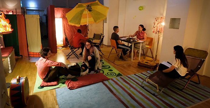 Wann hast du zuletzt einem fremden Menschen ein Geheimnis anvertraut, in einer Fantasiesprache gesprochen, oder versucht mit geschlossenen Augen den Duft von Rosen und Lavendel zu unterscheiden? Das Regie-Duo Richard Schmetterer und Iris Schmid lässt mehr als ein Dutzend junger Akteure und Akteurinnen, zu Bewohnern ihrer Fabelwelt werden, in der wir all das tun oder auch nicht tun. Nach dem Motto: "Alles kann, nichts muss", wählt jeder Besucher seinen eigenen Weg, durch die mit bunten Stoffen ausgeschmückten und liebevoll dekorierten Räume. Dieser kann zum Beispiel ins Tipis des Vertrauens führen, vorbei am Glücksgenerator, mit Stopp in der One-Man-Disco. Nach einem kurzen Sprung in die Weltverbesserungsagentur scheint dann alles ein bisschen leichter, wenn man bei einer Tasse Tee darüber nachdenkt, wie Vertrauen riechen könnte. Vollendet scheint der Spaziergang mit einem Besuch im Ballast-Palast. Das stille Örtchen, an dem ausschließlich unglückliche Gedanken herunter gespült werden.