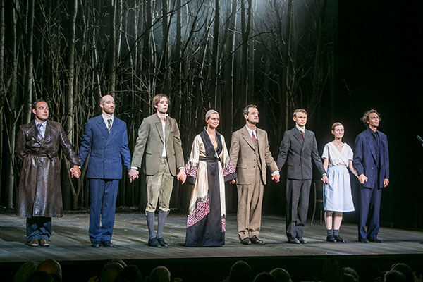 Thomas Ostermeiers Regie führt mit minimalistischer Ausstattung den Ich-Erzähler in "Jugend ohne Gott" durch rasant wechselnde Krimi-Szenen. Ein hereingerolltes Pult, ein Tisch, Bett, Zelt, Projektionen und Lichtwechsel reichen völlig aus. Ein achtköpfiges Ensemble schlüpft gewitzt in unzählige Rollen. Von Ödön von Horváth selbst sind Briefe überliefert, in welchen er sich dem Schriftstellerverband des Dritten Reichs andient. Aus diesem Zwiespalt heraus ist auch die Figur des Lehrers zu lesen. Zeigt dieser sich aufrichtig antifaschistisch, verliert er seinen Job. Schlussendlich muss er die umgekehrte Fluchtroute von heute auf sich nehmen: Der Pfarrer vermittelt ihm einen Job als Lehrer in Afrika.