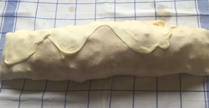 Den Strudel nun einrollen, vorsichtig aufs Blech transferieren und mit zerlassener Butter bepinseln.