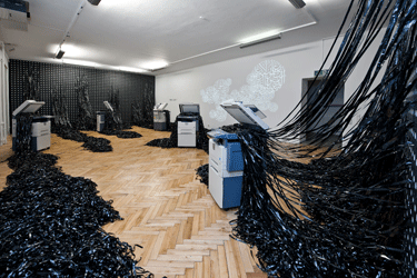Augenscheinlich ebenso anarchisch geht es beim Projekt des Marokkaners und Aussteller auf der 10. Lyon Biennale, mounir fatmi, zu: "Ghosting" beschreibt einen Zustand, in welchem das Material, dem wir unser Wissen anvertrauen, zu handeln beginnt, Kassettenbänder von Kopiermaschinen verschlungen bzw. reproduziert werden und projizierte arabische Schriftzeichen an der Wand fortwährend im Rewind- und Fast-Forward-Takt rotieren. Die Installation birgt die Reflexion darüber, wie Medienbilder konstruiert, verbreitet, archiviert werden, und schließlich ins kollektive Gedächtnis übergehen.