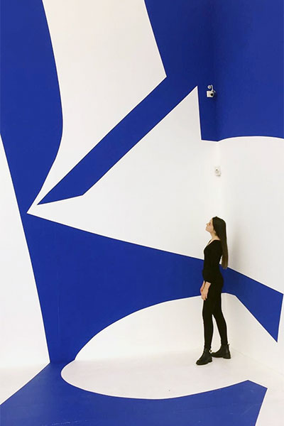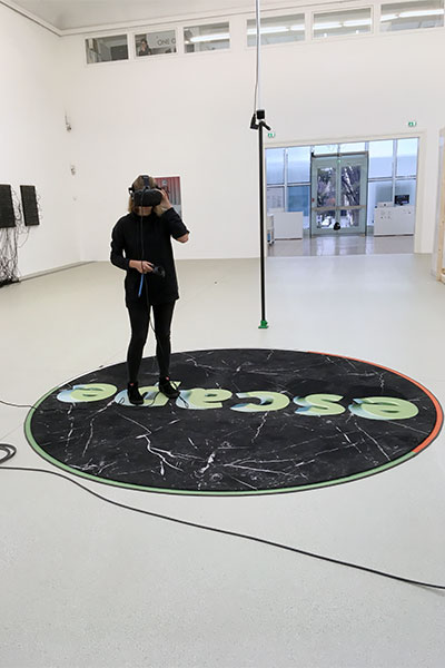 Die beiden Hauptinstallationen im Erdgeschoss der Ausstellung gestalten sich in den Arbeiten von Banz, Bowinkel und Dannert. In der Mitte des Raums wartet mit "Palo Alto" eine weitere VR-Station. Die Besucher/innen finden sich nach Aufsetzen der Brille auf einem eigens von Banz & Bowinkel entworfenen virtuellen Plateau wieder, auf dem sie sich frei bewegen und neben vorbeischreitenden Avataren die Umgebung erkunden können. Durch die einzigartige VR-Technik wird ermöglicht, die illusorische Wirklichkeit körperlich erfahrbar zu machen und für ein überaus reales Erlebnis zu sorgen, das nach Absetzen der Brille räumliche Neuorientierung zur Folge hat. Die zweite ins Auge stechende Arbeit ist "cut-out" von Frauke Dannert. Die begehbare Installation aus blauer und weißer Farbe vermittelt bei Betreten den Eindruck, als Person in den Raum gezogen zu werden und täuscht auf eine wesentliche Veränderung der Dimension hin. Es geschieht ein nahtloser Übergang von der einfachen Fläche in den Raum.