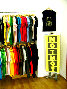 Das MotMot befindet sich im 7.Bezirk. Hier gibt es viele kleine Läden, Galerien und Kooperation mit Gleichgesinnten, dennoch ist die Geschichte des MotMot international geprägt. Begonnen hat nämlich alles in L.A., da arbeiteten Anna Breitenberger und Steve Reeder, beide haben Grafikdesign studiert, bei einer Streetwear Firma. Sie kamen auf einer Siebdruckmesse in München auf die Idee T-Shirts mit selbst gestalteten Motiven anzubieten. DIY-Way - Do it yourself! Das war die Geburtsstunde des MotMot Shop.
