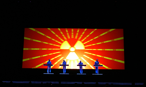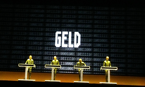 Aber wieder zurück zum Konzert. Nach dem kompletten "Autobahn" Album gab es ein mehr oder weniger chronologisches Best of, wobei die Alben "Die Mensch-Maschine" und "Computerwelt" fast zur Gänze gespielt wurden und von "Electric Café" (alias "Techno Pop"; 1986) immerhin die komplette A-Seite. Am meisten war ich gespannt auf die 3D-Visuals, und auch wenn es dabei einige wunderbare Momente gab, kannte man den Großteil bereits, nur halt in 2D - zu sehen auf der Doppel-DVD Minimum-Maximum (2005). Die filmischen Höhepunkte waren sicherlich "Die Roboter", "Metropolis", "Spacelab", sowie die visuelle Aufarbeitung der B-Seite von "Autobahn". Der Rest war in erster Linie ein Klangerlebnis mit einigen wenigen tontechnischen Problemen. Nach fast exakt zwei Stunden endete der Blick in den Rückspiegel, die Performance, wie üblich mit "Musique Non-Stop", bei dem sich die vier Musik-Arbeiter musikalisch individuell verabschiedeten. Letzten Endes ein Konzert mit schalem Nachgeschmack, da (selber schuld) zu hohe Erwartungen vor allem an das 3D-Erlebnis gestellt wurden und man zudem irgendwie ständig den Eindruck erhielt, dass es sich für Kraftwerk bloß um eine weitere routiniert abzuspulende performative Pflichtübung handelt. //
