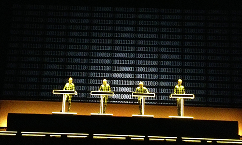 Einen Klassiker der Musikgeschichte live auf der Bühne zu reproduzieren bzw. im besten Falle neu zu interpretieren, ist nicht neu, man denke nur an Lou Reed ("Berlin Live at the St. Ann's Warehouse" im Dezember 2006 und verschiedene Folgeauftritte, die ihn im Juli 2008 sogar nach Wien führten) oder an Van Morrison ("Astral Weeks Live at the Hollywood Bowl" am 7. und 8. November 2008). Und auch den Werkskatalog, also Album für Album Abend für Abend, auf die Bühne zu bringen ist nicht ganz neu. Im Mai und Juni 2008 brachten Ron und Russell Mael - besser bekannt unter dem Bandnamen Sparks - ihr Gesamtwerk auf die Bühne. 20 Konzertabende in Londons Carlington Island Academy, fein säuberlich chronologisch aufgearbeitet - zudem gab es nach jedem live gespielten Album ein Best of Programm - und (das damals gerade neu veröffentlichte) Album Nummer 21 Exotic Creatures of the Deep schließlich im Shepherds Bush Empire. Ziemlich genau vier Jahre nach Sparks setzte diese Idee auch die in Düsseldorf beheimatete Band Kraftwerk um. Die erste diesbezügliche Retrospektive fand im Museum of Modern Art (NY City) statt, seither gab es einige Mehrfachabende an ausgewählten (zum Teil) musealen Orten, wie z.B. in London in der Tate Modern oder im März 2014 in der Walt Disney Concert Hall in Los Angeles. Und im Mai 2014 war also das Burgtheater Wien im Rahmen der Wiener Festwochen an der Reihe. Im Gegensatz zu Sparks benötigte Kraftwerk nur acht Konzerte, und da der Schweißfaktor gering ist, geht sich das alles sogar an vier Abenden aus, umso mehr, da es sich bei dieser Konzertreihe nicht um das Gesamtwerk handelt. Die ersten drei Alben "Kraftwerk" (1970), "Kraftwerk 2" (1972), "Ralf und Florian" (1973) werden nämlich verschwiegen, als schäme man sich dafür, dass ursprünglich auch konventionelle Instrumente eingesetzt wurden wie Gitarre, Bass, Flöte, Violine, Harmonika, Xylofon und Schlagzeug. Da aber auch auf dem Album "Autobahn" (1974) konventionelle Musikinstrumente zum Einsatz kamen, gefällt mir eine andere These besser, warum nur acht Alben im Kanon von Kraftwerk aufscheinen. Diese bezieht sich auf das Lied "Nummern" aus dem Album "Computerwelt" (1981), in dem in verschiedenen Sprachen wie Englisch, Deutsch, Russisch, Japanisch, Spanisch und Französisch von eins bis acht gezählt wird.
