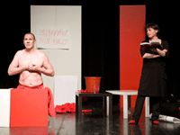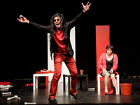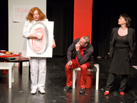 Die Eroberung der Leidenschaft, blinde Wut als Projektionsfläche, Miteinander und Gegeneinander, fluoreszierende Wortströme und kontroverse Lebenspraktiken, blutige Gefühle und Wortklaubereien, grandios umgesetzt von den drei Darstellern Karl Hoess, Wiltrud Schreiner und Alexandra Tichy. Eröffnet wurde der Minidramen-Reigen mit einer blutstäblichen Flaggen- und Zeichensprache von Michéle Métail, quasi das Blut als roten Faden des Abends in Morse buchstabierend. Aber halt. Nicht, dass jetzt jemand glaubt, nur weil Blut als Thema, sei alles todtraurig, todernst und grausam grauslich. Sicher, der Tod ist omnipräsent, so wie die Wut und (bzw. auf) die (Freunderl-)Wirtschaft(skrise), dies alles, in den meisten Fällen jedenfalls, in leicht schwermetalligen tief abgründigen Humor getaucht. Das bewies gleich mal Johannes Schrettle, der uns mitteilte: "Es folgt ein Tag im Leben einer österreichischen Kleinstadt, in deren Zentrum ein Schwein geschlachtet wird und im Sterben Werbung für die Genussregion Graz Umgebung macht". Aber eigentlich will Frau Schneiderer, die wenig Zeit hat, einen Tantra-Reiseführer schreiben und trifft auf Herrn Schrettle. Ein Minidrama über das Verlangen? Ja, Verlangen nach Geld - und von einem Auto werden sie auch noch überfahren, obwohl es ihnen gar nicht richtig auffällt. Kurios? Ja. Grandios? Ebenfalls. Herausragend unter den vielen sehr guten Minidramen auch "Blinde Wut" von Gerhard Jaschke. Ein herrlich schäbiger Text, eine Hasstirade, ein Beschimpfungsorgasmus, der, typisch Jaschke eben, in all seiner Brutalität Witz versprüht, so z.B. wenn der Verleger den Dichter verhöhnt, wenn er geifert: "Deinen Namen werde ich falsch setzen und dein Stück auf dem miesesten Papier kopieren." Die 25 Minidramen, obwohl jede für sich abgeschlossen, in den Kreislauf eines stimmigen Theaterabends zu bringen, gelang dem Team in verblüffend einfacher Manier, Stichwort Bühnenbild. Was zählte waren die Geschichten und die Gesichter, die Gesten und die Zwischentöne, die Mimiken und die Wortprägnanz. "Jedenfalls", um aus Lisa Holzers Beitrag "Lisa Holzer und die Drunken Bakers" zu zitieren, "geht es um Verführung - um Sprache, Denken, Lesen, Wiederlesen, Öffnen - und nur vielleicht um Verstehen". Z.B. dann, wenn es um Heinz und Felix, also um "Heinix" [von Markus Köhle; Anm.] geht, deren höchste abgeschlossene Ausbildung Ketchup ist. Aus 78 % sonnengereiften spanischen Tomaten sind sie dennoch das Produkt eines österreichischen Traditionsbetriebes, oder wie es an anderer Stelle bei Elfriede Czurdas Minidrama "Blut spricht" heißt: "Du bist der Boden, den ich sättige. Ich vernasche Feind und Freund". Oh ja, das passte alles zusammen und machte verdammt viel Spaß. Kurzweilig, ex- und konzentrisch. Alles tropft. Ah! Oh! Absobult. (Text: Manfred Horak; Fotos: Hans Zurucker)