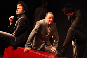 Franz Biberkopf, ehemaliger Transportarbeiter und soeben aus dem Zuchthaus entlassen, beschließt anständig zu sein. Ein ehrliches Leben will er führen, also nimmt er auch ehrliche Gelegenheitsarbeiten an, steht am Berliner Alexanderplatz als Straßenhändler und Zeitungsverkäufer und verbringt seine Abende in Lokalen, in denen auch Zuhälter ihre Abende verbringen. Biberkopf flüchtet vor seiner eigenen Vergangenheit und scheitert dabei, als er Freundschaft mit dem skrupellosen Verbrecher Reinhold schließt. Er lässt sich von seinem neuen Freund im Tauschhandel mit Frauen versorgen, wird in Verbrechen hineingezogen und verliert einen Arm, weil Reinhold ihn unter ein Auto stößt. "Verflucht ist der Mensch, der sich auf Menschen verlässt", ist gewisser Weise das Leitmotiv von "Berlin Alexanderplatz". Biberkopf gelangt schließlich zu der Überzeugung, dass das Anständigbleiben in dieser Welt nicht lohne, sucht und findet in Folge eine Braut und wird ihr Zuhälter. Reinhold raubt jedoch Biberkopfs Mieze, vergewaltigt und erwürgt sie. Nächster Aufenthalt von Biberkopf: Irrenanstalt. Matthias Messner, Robert Stuc und Peter Pausz als Einer, Zweier, Dreier kommentieren homophon das Geschehen, belehren, warnen, erklären, zitieren Werbesprüche und Statisitiken und überhöhen so die ganze expressionistisch-naturalistisch-mystische Vielstimmigkeit. Die Drei leisteten dabei ganze Arbeit, immer präzise, quasi in time. Ein enorm wichtiges und klug gewähltes Stilmittel, um die Geschichte voranzutreiben. Überhaupt: Das Ensemble ist bestens aufeinander abgestimmt und brilliert als Kollektiv. Darüber hinaus sind auch die Einzelleistungen in ihrer Vielseitigkeit bemerkenswert, allen voran Tristan Jorde, der im Berliner Jargon daherschnäuzelt und mit seinen vielen Gesichtsausdrücken auch dann Bände spricht wenn er nicht spricht. So funktioniert auch diese Bühnenfassung bestens [übrigens von Stephan Döblin, dem jüngsten Sohn des Autors, genehmigt, was nicht selbstverständlich ist; Anm.], indem die verschiedenen Handlungsstränge mit dauerndem Wechsel der sprachlichen Mittel und den Filmausschnitten Hand in Hand gehen. Dieses Stilprinzip der Montage bzw. Collage übernahm Werdeker direkt von Döblin und funktioniert heute vermutlich besser denn je, denn Döblin war mit "Berlin Alexanderplatz" seiner Zeit weit voraus - und gleichzeitig vorausblickend, die Apokalypse war ja bereits im Anrollen, wenn auch die Folgen bei Erstveröffentlichung noch nicht absehbar waren. Döblin schilderte nicht nur die Großstadt als Pandämonium, sondern auch bereits 1929 das Schreckensszenario der Nazis, die später sein Buch verbrannten, und vor allem den Menschentypus Mitläufer. Die Hektik vor dem Untergang, in denen die schrecklichen Engel unsichtbar durch die Straßen schreiten, auf denen sich Menschenmassen im Totentanz wiegen. "Wach sein. Dem Menschen ist gegeben die Vernunft, die Ochsen bilden stattdessen eine Zunft." Sollte man gesehen haben. (Text: Manfred Horak; Fotos: Barbara Pálffy)
