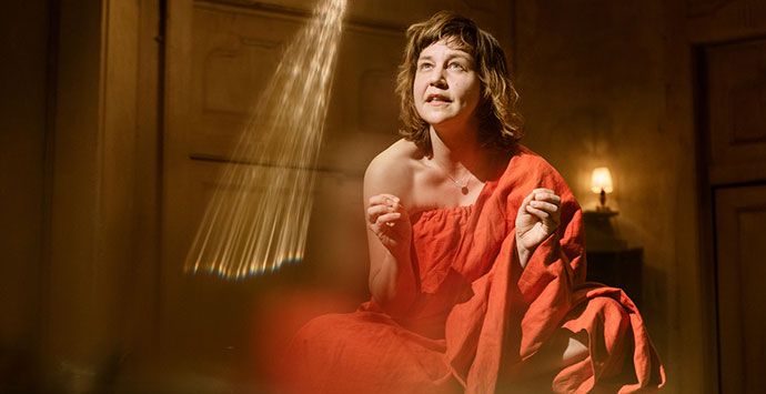 Als Geschichtenerzählerin Sam geleitet sie das Publikum - im Rahmen einer Baridylle ("Sam's Bar") können auf im Raum aufgestellten Tischen auch Speisen und Getränke konsumiert werden - durch den Abend. Die Figuren der Geschichten, die sie erzählt, spielt sie selbst. Zum einen wäre da Lea, die sich unter "Oi"-Schreien krümmt als der Geist von Chanan in sie fährt. Den am gebrochenen Versprechen von Leas Vater, seine Angebetete zur Frau nehmen zu dürfen, verstorbenen Liebenden gibt sie zum anderen kurz zuvor. Beide Figuren stammen aus dem Stück "Der Dibbuk" von Salomon An-Ski, dessen Aufführungs-Geschichte sich auch in die Geschichte des Hamakom Theaters eingeschrieben hat. Dargeboten durch die Truppe Habimah, die später das Nationaltheater in Israel begründen sollte, war es das letzte Stück, das im Hamakom (damals "Jüdische Künstlerspiele") vor dem Anschluss Österreichs an Deutschland und seiner Arisierung und Schließung zu sehen war.