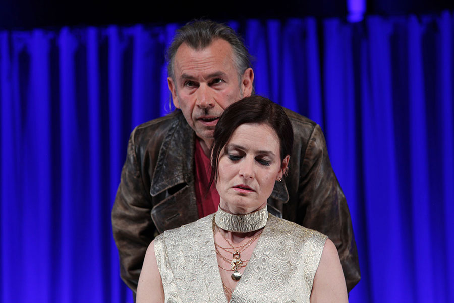 Sabine Lorenz verkörpert die gealterte Königin, gequält von Freiern erzählend, die nicht um sie sondern um Macht buhlen, zugleich den Heimkehrer zurückweisend, der es wagt, sie, die Königin, wie eine Frau anzusehen. Sie weiß wohl, dass ihr Mann all die Jahre nicht Treue hielt wie sie. Vom Patriarchat zurückgedrängt in den engen Raum des eigenen Zimmers, ist ihre große melodramatisch überhöhte Frage an Odysseus, warum er denn zurückgekehrt ist.