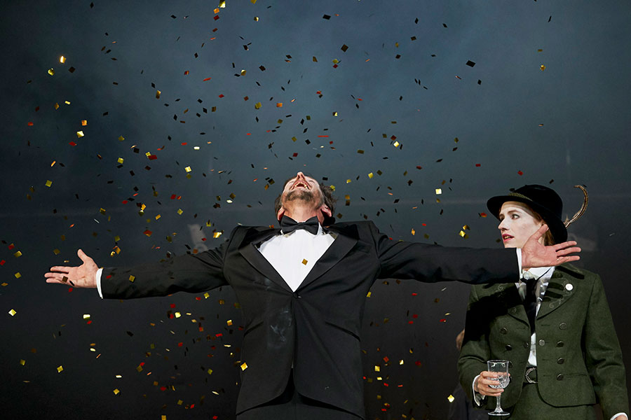 1825 als Huldigung für die Habsburger geschrieben, ist Grillparzers Stück keine leichte Kost für die Gegenwart. Gut gestrichen und von Dramaturgin Stephanie Gräve mit Texten von Heinrich Heine und Robert Menasse ergänzt, bleiben den Klassikliebhaber/innen die bekanntesten originalen Textstellen zum Genuss, während sich die Zeitgenössler/innen an Bezügen zu H.C. Strache, Wladimir Putin, Julija Tymoschenko u.a. erfreuen. Zu starker Tobak für manche aus dem Premierenpublikum, wie die gelichteten Reihen nach der Pause zeigten.
