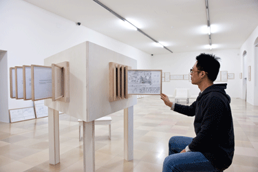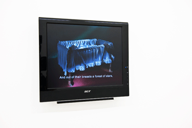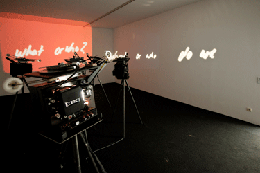 Augenscheinlich ebenso anarchisch geht es beim Projekt des Marokkaners und Aussteller auf der 10. Lyon Biennale, mounir fatmi, zu: "Ghosting" beschreibt einen Zustand, in welchem das Material, dem wir unser Wissen anvertrauen, zu handeln beginnt, Kassettenbänder von Kopiermaschinen verschlungen bzw. reproduziert werden und projizierte arabische Schriftzeichen an der Wand fortwährend im Rewind- und Fast-Forward-Takt rotieren. Die Installation birgt die Reflexion darüber, wie Medienbilder konstruiert, verbreitet, archiviert werden, und schließlich ins kollektive Gedächtnis übergehen.
