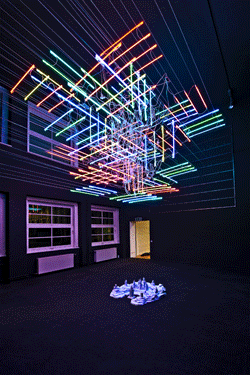 Ein Déjà-vu dürfte Besucher/innen der Venedig-Biennale 2009 somit bei Betrachtung von Chu Yuns "Constellation" beschleichen. Ein abgedunkelter Raum birgt unzähliges technisches Bürogerät, vom Computerbildschirm und Scanner bis zu Fax und Kopiermaschine, welches sich über chaotisches Blinken programmierter Fehler- oder Standby-Modi zu erkennen gibt. Satteliten-gleich scheinen die Apparaturen unverständliche Botschaften, die im üblichen Arbeitsalltag unbemerkt bleiben, in das ihnen gegebene Universum verbreiten zu wollen.