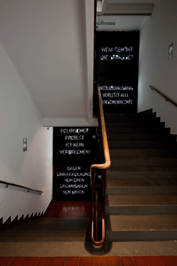 Power Tower der Energie AG OÖ Böhmerwaldstraße 3, 4021 Linz Öffnungszeiten: Mo - Fr 8 bis 18 Uhr Sa 10 bis 15 Uhr an Feiertagen geschlossen, Eintritt frei. Bildtexte: Eija-Liisa Ahtila (Where is Where?, 2007–2008), Vyacheslav Akhunov (1 m², 2007), Nevin Aladag (Teppich / Läufer, 2001/2010), Rosa Barba (Coro Spezzato: The future lasts one day, 2009), Taysir Batniji (Hannoun, 1972-2009), Bestué-Vives (Proteo, 2009), Sylvie Blocher (A More Perfect Day, 2009), Carlos Coronas (Sin Lugar / Nowhere, 2007 / 2010), Lado Darakhvelidze (Ideal Media, 2009), Etcétera... (Errorist Kabaret, 2009), mounir fatmi (Ghosting, 2009), Laurent Grasso (Untitled, 2009), In Serial (On Track, 2009), Maryam Jafri (End of End), Haejun Jo, Donghwan Jo (Amazing Father—Oral Statement Drawing Series, 2005 US Army and Father—Documentary Drawing Series, 2002–2009), Carlos Motta (Untitled Graffiti Cuts: Who Owns the Street?, 2009), Erkan Özgen (Origin, 2008), Sheung Chuen Pak (Breathing in a House, 2006), Jinoos Taghizadeh (Good Night, 2009), Sue Williamson (What About El Max?, 2004–2005), Chu Yun (Constellation, 2006), Nevin Aladag (Teppichsäule, 2004/2010), Nika Oblak & Primož Novak (The Box, 2005)