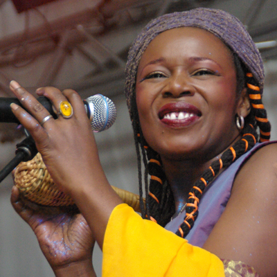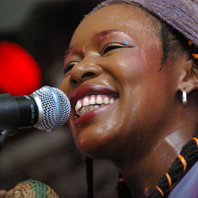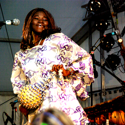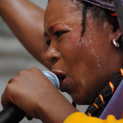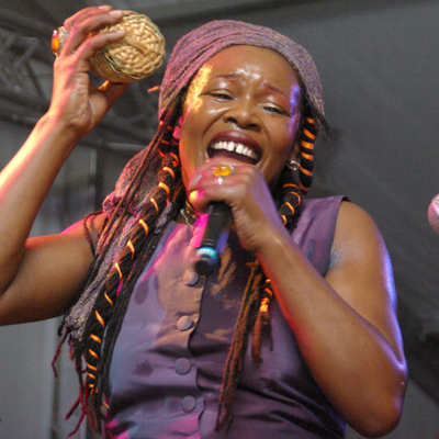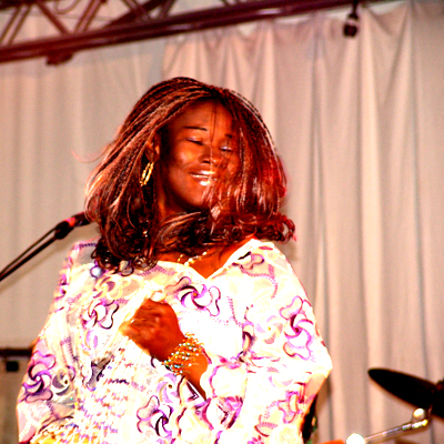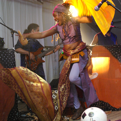Getoppt werden konnte der Auftritt von Magou – es wurde bereits angedeutet – nicht mehr, obwohl der eigentliche Star des Festivals am Samstag den großen Auftritt hatte: Sally Nyolo. Im ersten Teil des Konzertabends spielte sich der in Wien lebende Mamadou Diabate & Percussion Mania feat. Aisha Sanou durch ein mittelprächiges Set, das leider nur allzu rasch Ermüdungserscheinungen und eine gewisse Ideenlosigkeit zeitigte. Sally Nyolo hatte es daher sehr leicht ein Balafon-müdes Publikum wiederzubeleben. Ihre Bühnenpräsenz alleine ist bereits derartig von Charisma und ungebremsten Elan geprägt, dass sie automatisch volle Aufmerksamkeit erhielt. Musikalisch drang ihre sehr gute Band tief in die Popgeschichte ein, würzte dies gekonnt mit Reggae und leicht Jazz genährten Polyrhythmen bis hin zum guten alten 12-Takter namens Blues. Ihre Gesangsstimme ist impulsiv und leidenschaftlich, immer voll auf der Höhe und im Einklang mit der Band. Die Frau weiß was sie tut und sie macht es wahrlich gut, mehr noch, hervorragend. (Text: Manfred Horak; Fotostrecke 1: Wolfgang Hancl, Manfred Horak; Fotostrecke 2: Wilfried Scherzer)