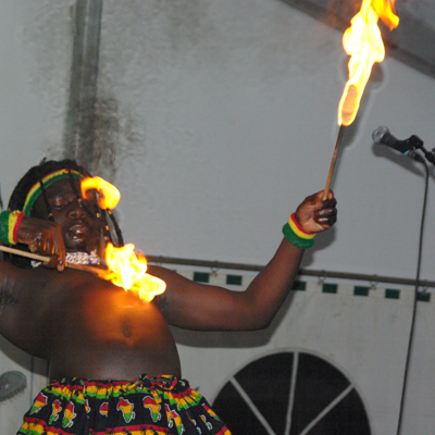 mit einem rasanten Percussion-, Tanz- und Feuerspektakel, und Wärme hatte man