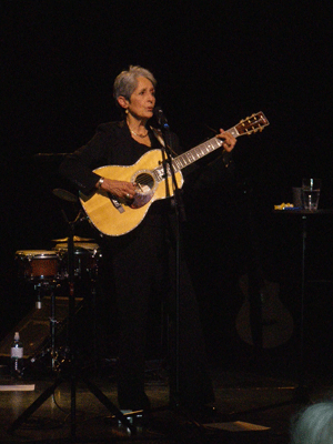 Kurzerhand war die junge Frau aus New York, die am heimischen Koffer-Radio normalerweise Rhythm & Blues oder Doo Wop lauschte, aufgrund eines Konzertbesuchs mit ihrer Tante von Folk fasziniert. Es folgten die ersten Konzerte und frühe Plattenaufnahmen, zumeist handelte es sich dabei um Traditionals, in der Stadthalle vertreten durch Songs wie "Silver Dagger", "Long Black Veil" oder "Railroad Boy". Mit Songs wie diesen stand Joan Baez in den frühen 1960er Jahren bald an der Spitze der damals blühenden Folk-Szene, die sie sich mit Künstlern wie Joni Mitchell oder Judy Collins teilte. Nicht zu vergessen Bob Dylan, den Baez auf einer Tournee im Jahre 1961 kennen lernte. Er war für sie nicht nur künstlerisch eine große Inspiration, sondern die beiden wurden bald darauf auch privat für einige Zeit ein Paar. Seitdem hat Baez viele Dylan-Songs im Studio aufgenommen, bzw. auch in ihr Live-Repertoire übernommen. "Forever Young" und "Don't Think Twice It's Alright" zählen seit jeher zu den Höhepunkten jeder Baez-Show, und so war es auch in Wien.