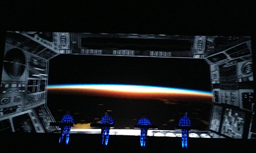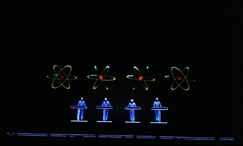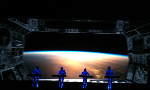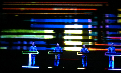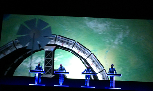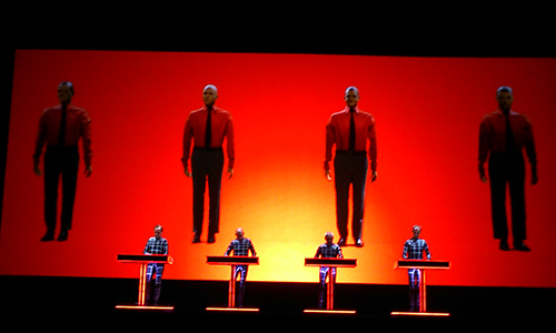 Aber wieder zurück zum Konzert. Nach dem kompletten "Autobahn" Album gab es ein mehr oder weniger chronologisches Best of, wobei die Alben "Die Mensch-Maschine" und "Computerwelt" fast zur Gänze gespielt wurden und von "Electric Café" (alias "Techno Pop"; 1986) immerhin die komplette A-Seite. Am meisten war ich gespannt auf die 3D-Visuals, und auch wenn es dabei einige wunderbare Momente gab, kannte man den Großteil bereits, nur halt in 2D - zu sehen auf der Doppel-DVD Minimum-Maximum (2005). Die filmischen Höhepunkte waren sicherlich "Die Roboter", "Metropolis", "Spacelab", sowie die visuelle Aufarbeitung der B-Seite von "Autobahn". Der Rest war in erster Linie ein Klangerlebnis mit einigen wenigen tontechnischen Problemen. Nach fast exakt zwei Stunden endete der Blick in den Rückspiegel, die Performance, wie üblich mit "Musique Non-Stop", bei dem sich die vier Musik-Arbeiter musikalisch individuell verabschiedeten. Letzten Endes ein Konzert mit schalem Nachgeschmack, da (selber schuld) zu hohe Erwartungen vor allem an das 3D-Erlebnis gestellt wurden und man zudem irgendwie ständig den Eindruck erhielt, dass es sich für Kraftwerk bloß um eine weitere routiniert abzuspulende performative Pflichtübung handelt. //