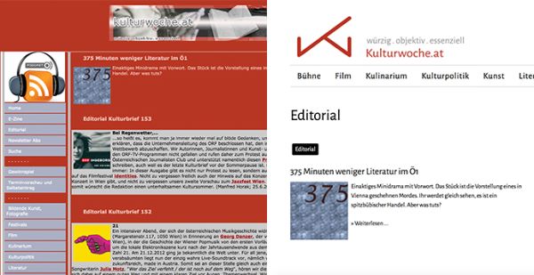 Die rotfarbige Webseite Kulturwoche.at streifte das alte Gesicht ab und schaut jetzt irgendwie anders aus. Irgendwie sehr anders. Nicht wieder zu erkennen. Nicht nur das Sichtbare hat sich verändert, auch das Unsichtbare. Das dahinter, stark veraltete, wurde zum State of the Art.